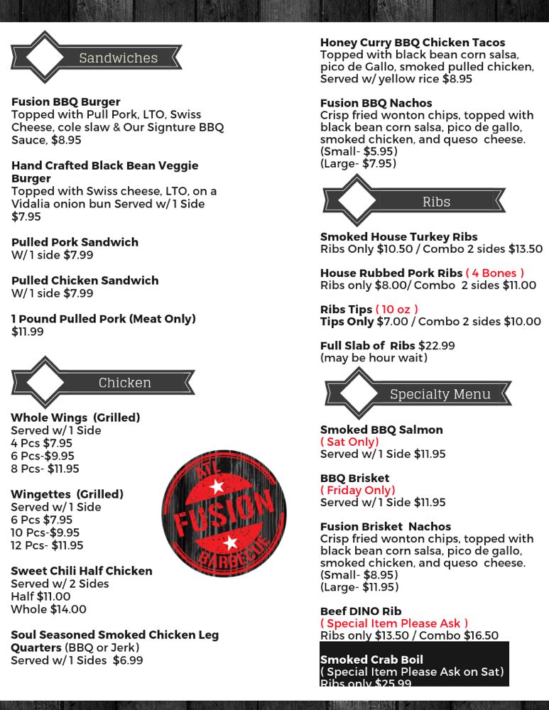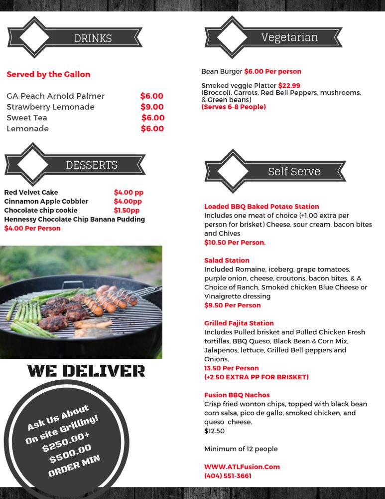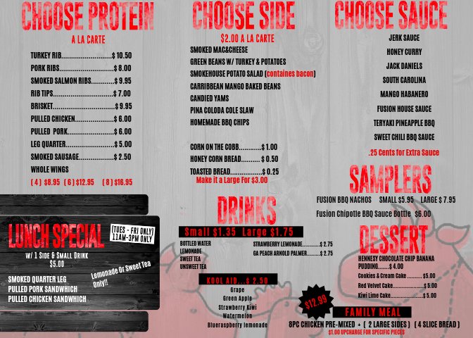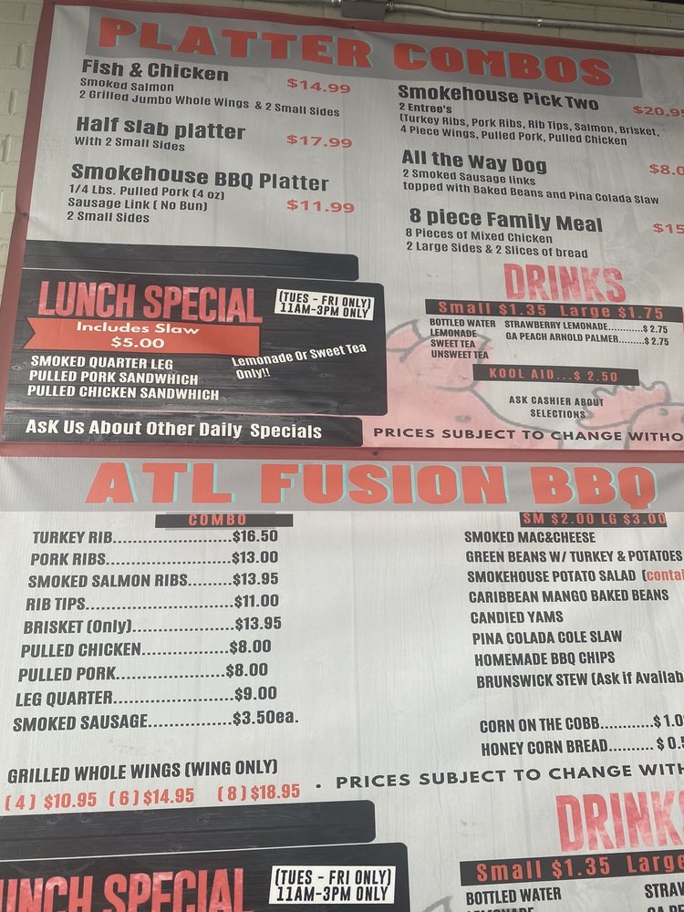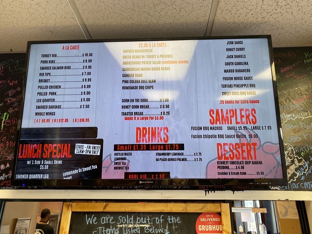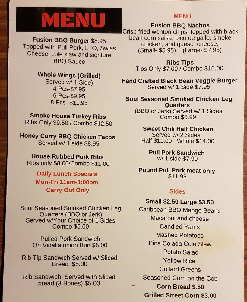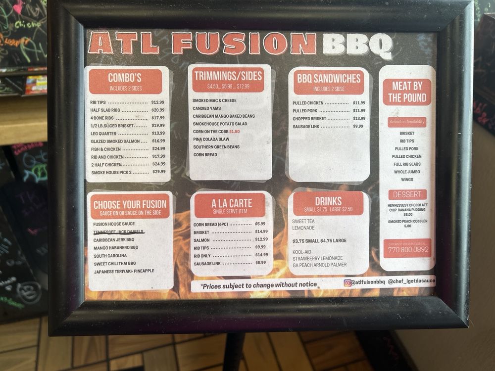 ATL Fusion BBQ, located in Marietta, GA, offers a soulful blend of Southern and Caribbean flavors in their barbeque and American cuisine. With a range of amenities like delivery, takeout, reservations, and outdoor seating, this black-owned establishment caters to all dining preferences. Specialties include rib tips, brisket combos, and smoked house sides like candied yams and macaroni and cheese. The dessert menu boasts unique treats like Hennessy chocolate banana pudding and peach cobbler. Customer reviews rave about the flavorful dishes, generous portions, and welcoming ambiance. While some reviewers mention minor hiccups, like salty food or wait times, overall, ATL Fusion BBQ stands out for its quality food, friendly service, and vibrant atmosphere. Experience the fusion of flavors and festive vibe at ATL Fusion BBQ for a memorable dining experience.